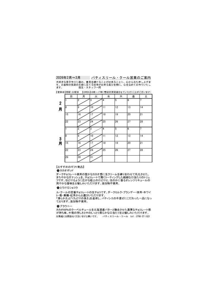 2月3月の営業日についてlecoeurtoyama2026-01-15T16:39:59+09:002026.01.15|お知らせ| 営業のカレンダー 2026.2.3 営業のカレンダー 2026.2.3 関連投稿 バレンタインデー商品のご案内 バレンタインデー商品のご案内 2026.01.15 2025年クリスマスケーキのご案内 2025年クリスマスケーキのご案内 2025.10.05 12月~2026年1月営業日のご案内 12月~2026年1月営業日のご案内 2025.10.05